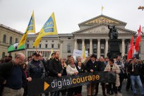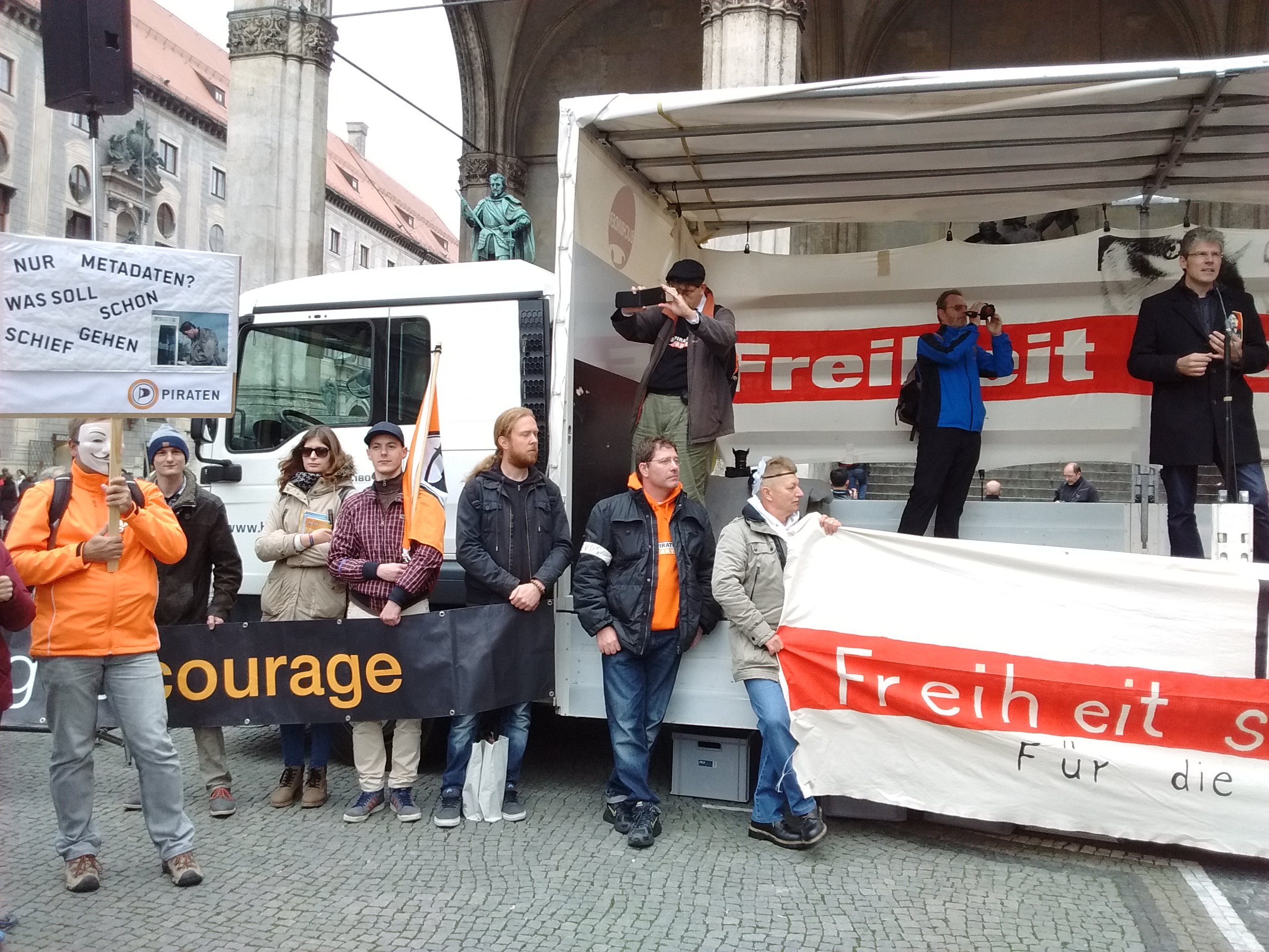 Vor dem Residenztheater ging es um 13:37 los.Nachdem The Scream mit guter Rockmusik auf die Demo aufmerksam gemacht hatte, begannen die Reden. Es redeten Nicole Gohlke von den Linken, Sylvia Jonigk von FIfF e.V., Jimmy Schulz für Load e.V., dann Kristos Thingilouthis politischer Geschäftsführer der Piraten. Sabine Leutheusser-Schnarrenberger hielt ab 14:00 ihre Rede auf dem Max-Joseph-Platz. Dann äusserte sich Dieter Janecek und als letzter Redner auf dem Max-Joseph-Platz hielt Florian Ritter seine Rede. Dann zogen die über 1000 Menschen die zur Demonstration kamen zum Odeonsplatz angeführt von einem Demolautsprecher wagen der aus 850 Kilometer Entfernung extra zur Demo gekommen war. Die Schlusskundgebung am Odeonsplatz wurde von Stefan ‚Sekor‘ Körner eingeleitet, es sprachen nochmal Jimmy Schulz, Kristo Thingiloutis, Sabine Leutheusser Schnarrenberger, Jan Tepperies und Florian Ritter.